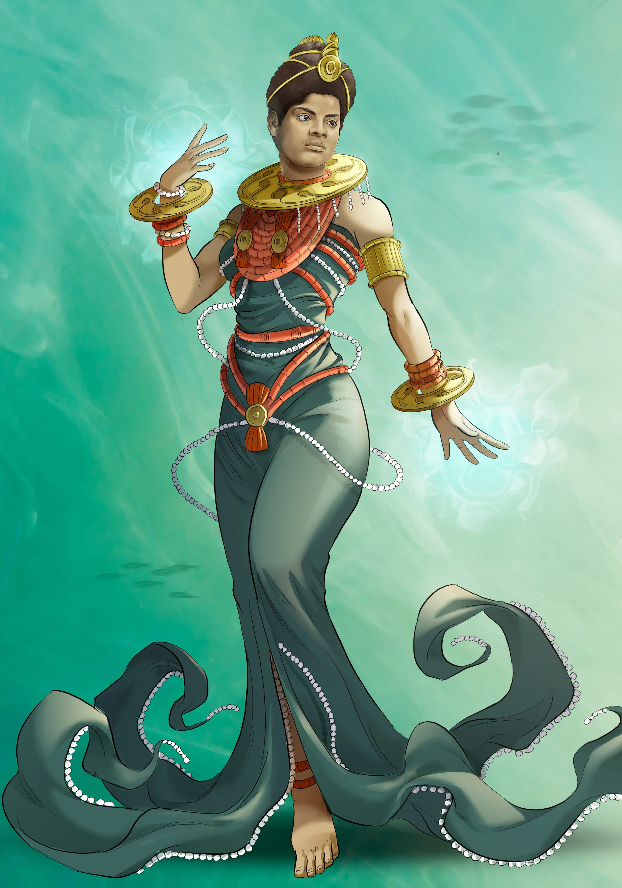 Yemoja is the African goddess of the ocean. Yemoja is motherly and strongly protective, and cares deeply for all her children. She is the protector of women.